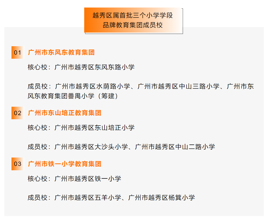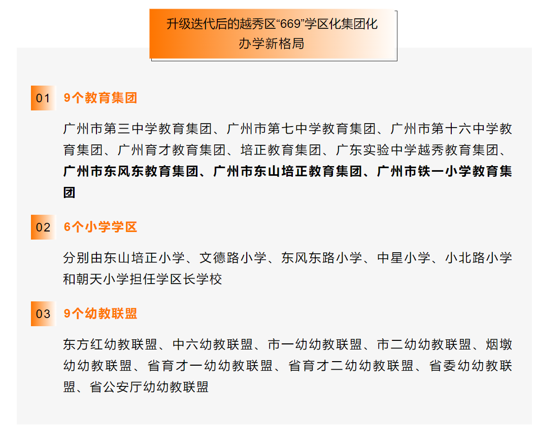越秀区是广州首个全面鼓动学区处分模式的城区。2021年4月,该区兼并区属中小学新一轮布局调度优化酿成“669”的学区化集团化办学新神志,其中6个区属辅导集团以中学为主。现存省级优质基础辅导集团1个,为广州十六中辅导集团,省级优质基础辅导集团种植对象3个,为广州七中辅导集团、培正辅导集团、越秀区东方红幼教定约。