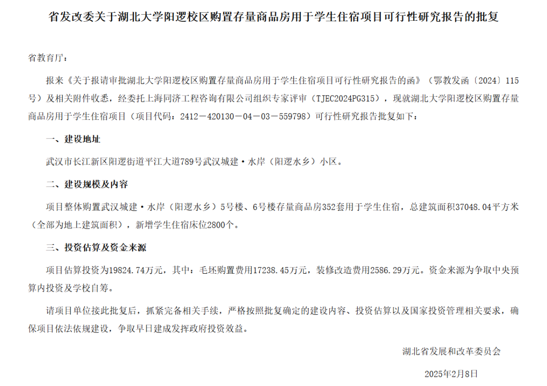 这份《对于湖北大学阳逻校区购置存量商品房用于学生住宿技俩可行性盘问阐发的批复》称,技俩举座购置武汉城建·水岸(阳逻水乡)5号楼、6号楼存量商品房352套用于学生住宿,总建筑面积37048.04平素米(沿途为地上建筑面积),新增学生住宿床位2800个。技俩估算投资为19824.74万元,其中毛坯购置用度17238.45万元,装修纠正用度2586.29万元。资金着手为争取中央预算内投资及学校自筹。